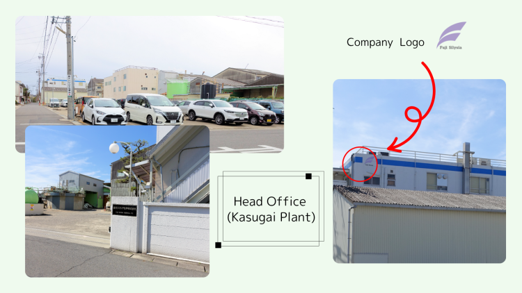 It takes about ten minutes to walk southwest from Kozoji station to Kasugai plant. During production, steam is rising from the chimney, so you might be able to figure out the approximate location. If you can see a building with a blue stripe on a white background, there are the head office and the plant office.