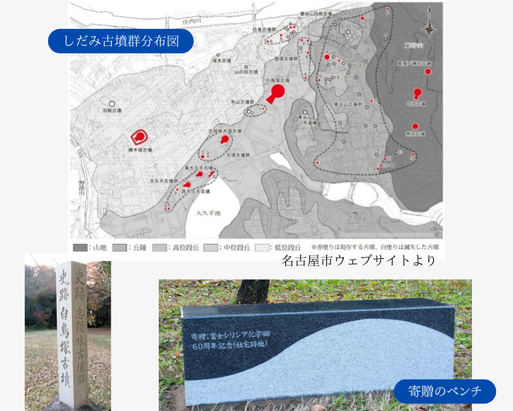 旧社名 富士デヴィソン化学㈱の時代にあった社宅跡地、現在の志段味古墳群の古墳「白鳥塚古墳」がある場所にベンチを寄贈致しました。