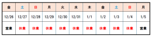 年末年始の営業につきまして下記のとおりご連絡差し上げます。